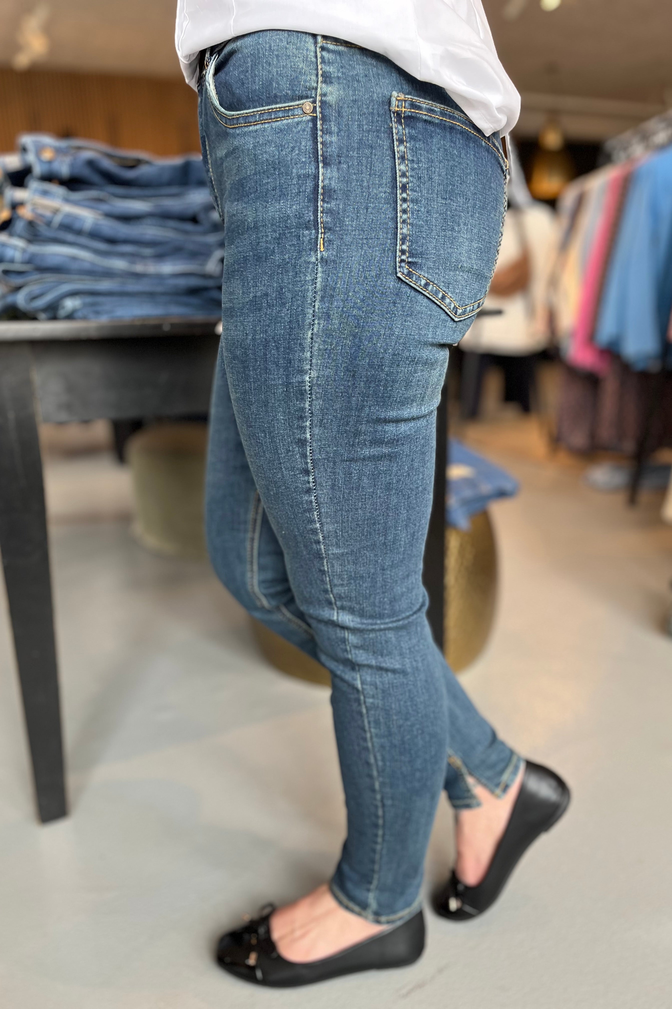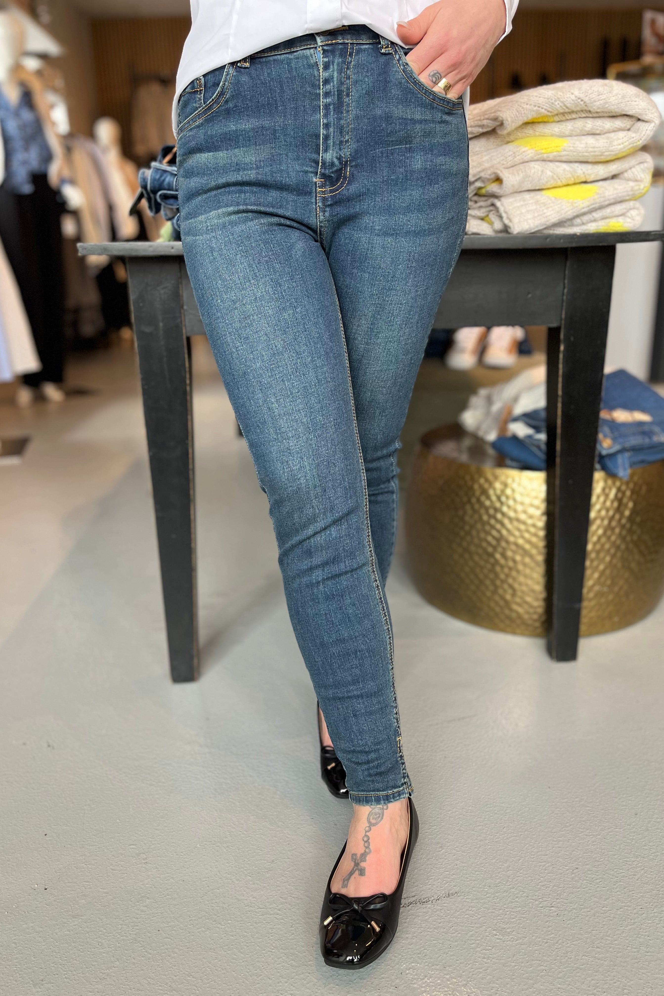 - Skinny jeans: Disse sitter tæt til benet och må gerne vara en anelse kortere, så de sitter perfekt vid anklen.